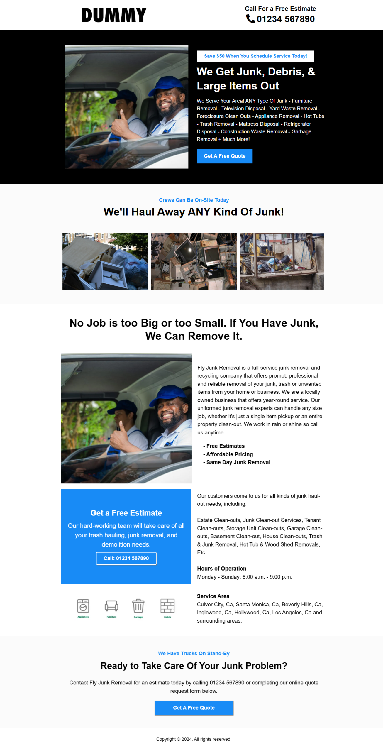 This optimized Junk Removal landing page is designed to captivate visitors, highlight your services, and turn traffic into qualified leads for your business.